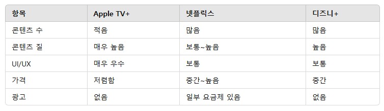 - 고품질 오리지널 콘텐츠와 애플 생태계와의 완벽한 연동성이 장점입니다.